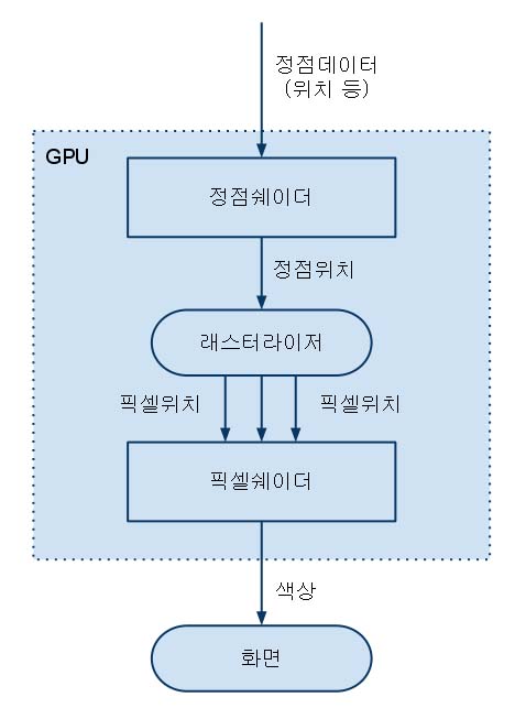 쉐이더의 주요 구성으로는 정점 쉐이더와 픽셀 쉐이더가 있다(더 많은 것이 있지만 생략).